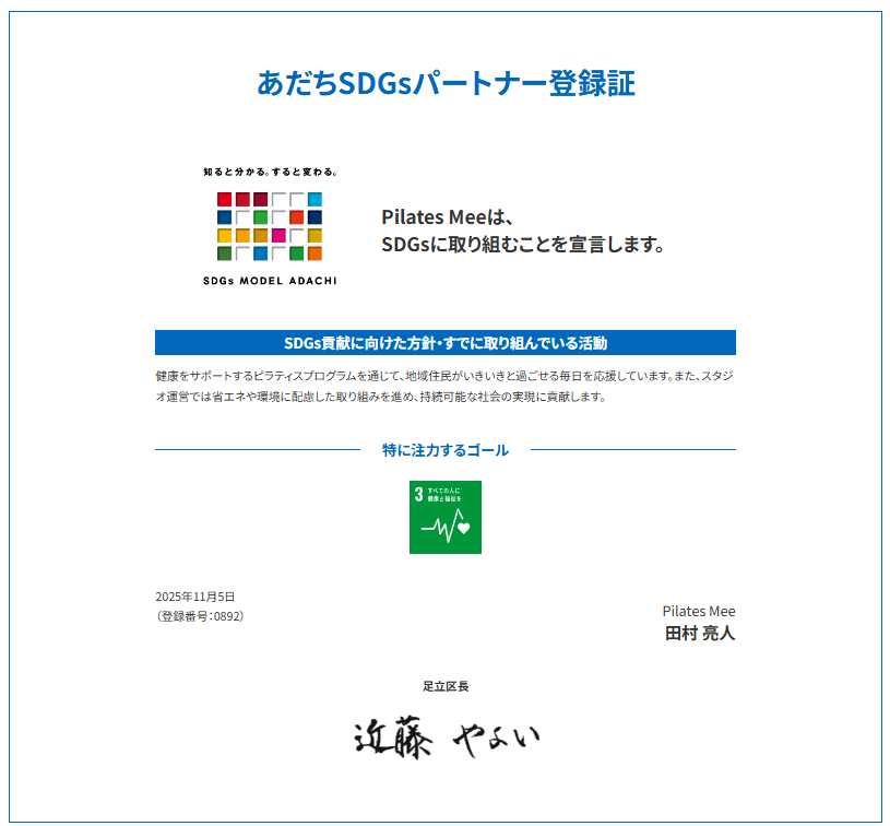 Pilates Meeおよび運営元の株式会社RiAGELでは、お客様が安心して通える環境づくりと、社会全体のサステナビリティ向上を重視しています。そこで、理念や活動内容が合致する各種団体へ加盟・宣言し、その取り組みを共有することで、スタジオとしての姿勢を明確にし、より多くの方との信頼関係を育んでいきたいと考えています。